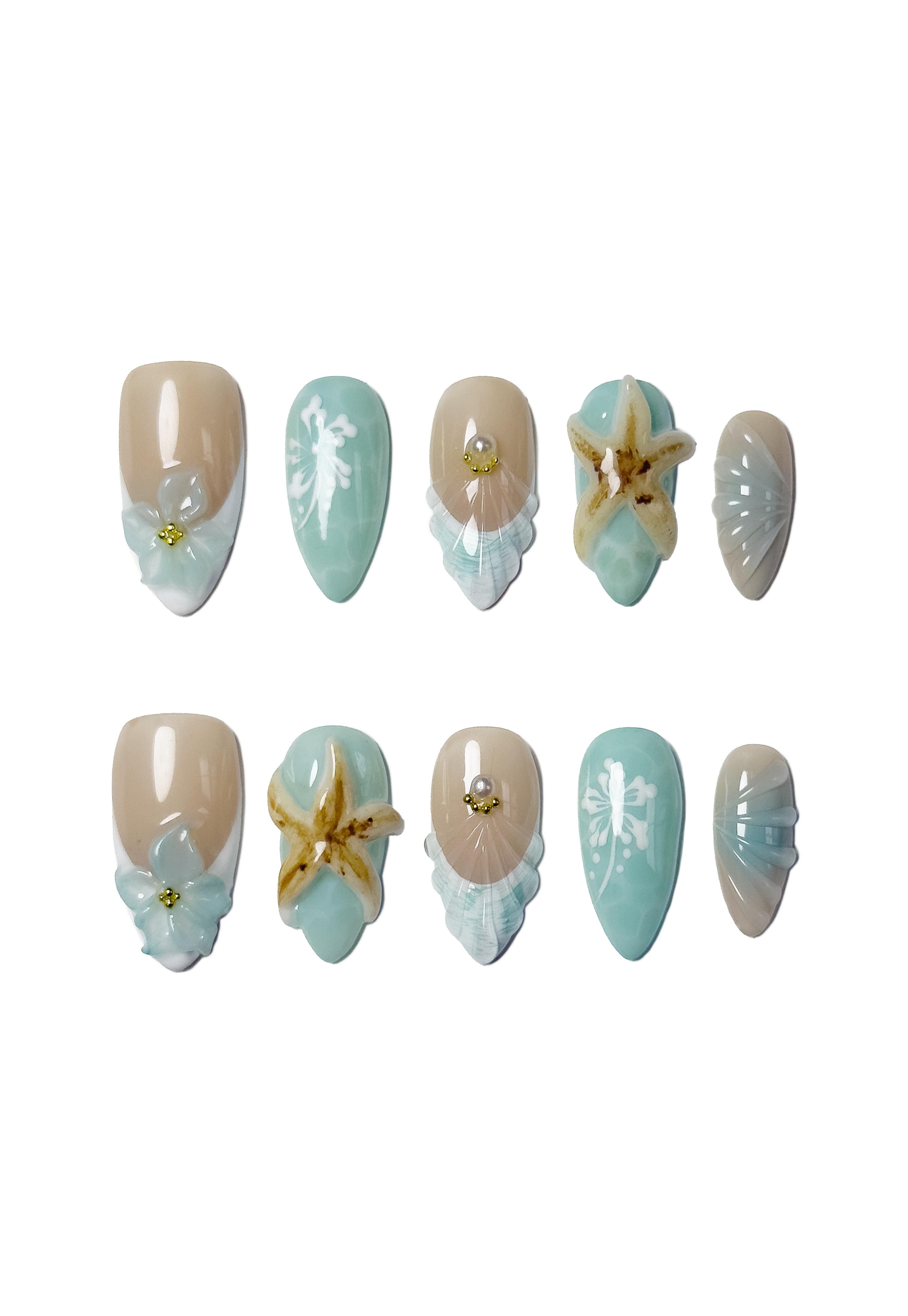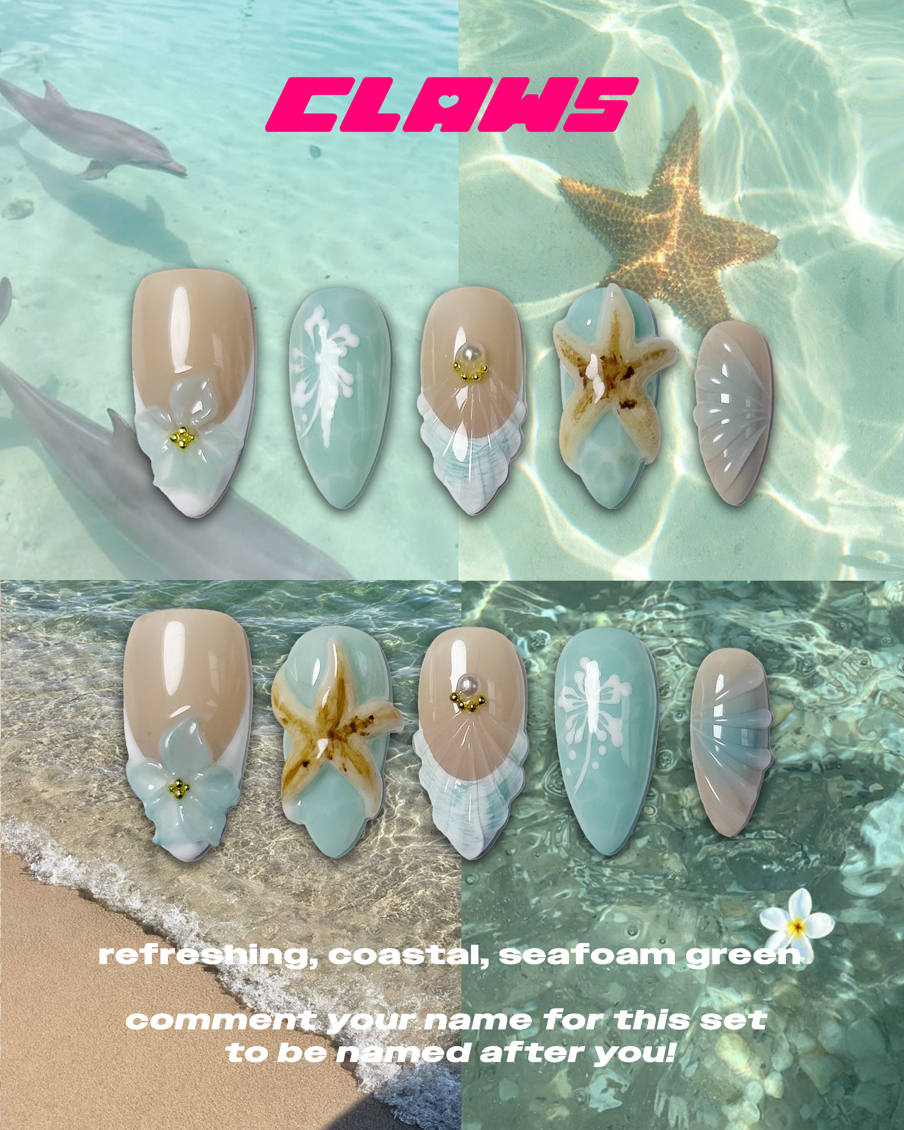 A new bombshell has entered the villa! And she is a breath of refreshing summer air. LIke a breeze in the heat of the summer. The seafoam green is her brightest feature, a perfect representation of crystal clear summer water, and reminiscent of the 2014 tumblr mint green. Featuring 3D sculpted flowers, 3D starfish, seashell design, hand painted hibiscus, and oh so many golden charms and pearls.