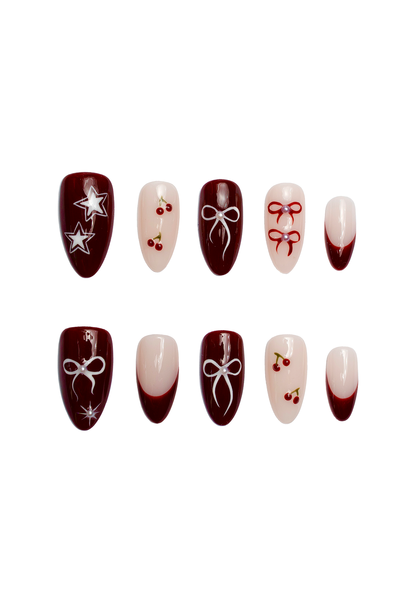 Miss Emma loves dark academia and she loves fall. She sips her latte as she paints her dark red coquette nails, decorating them with ribbons, gems, cherries, and stars. Whether you're looking to make a statement or simply add a touch of fun to your look, Claws' trendy nails are your top choice. Claws Instant Nails' high quality nails are long lasting, seamless, and takes only minutes to apply. Get ready for fall and embrace your inner coquette soft girl with Emma Dark Red Coquette Nails <3