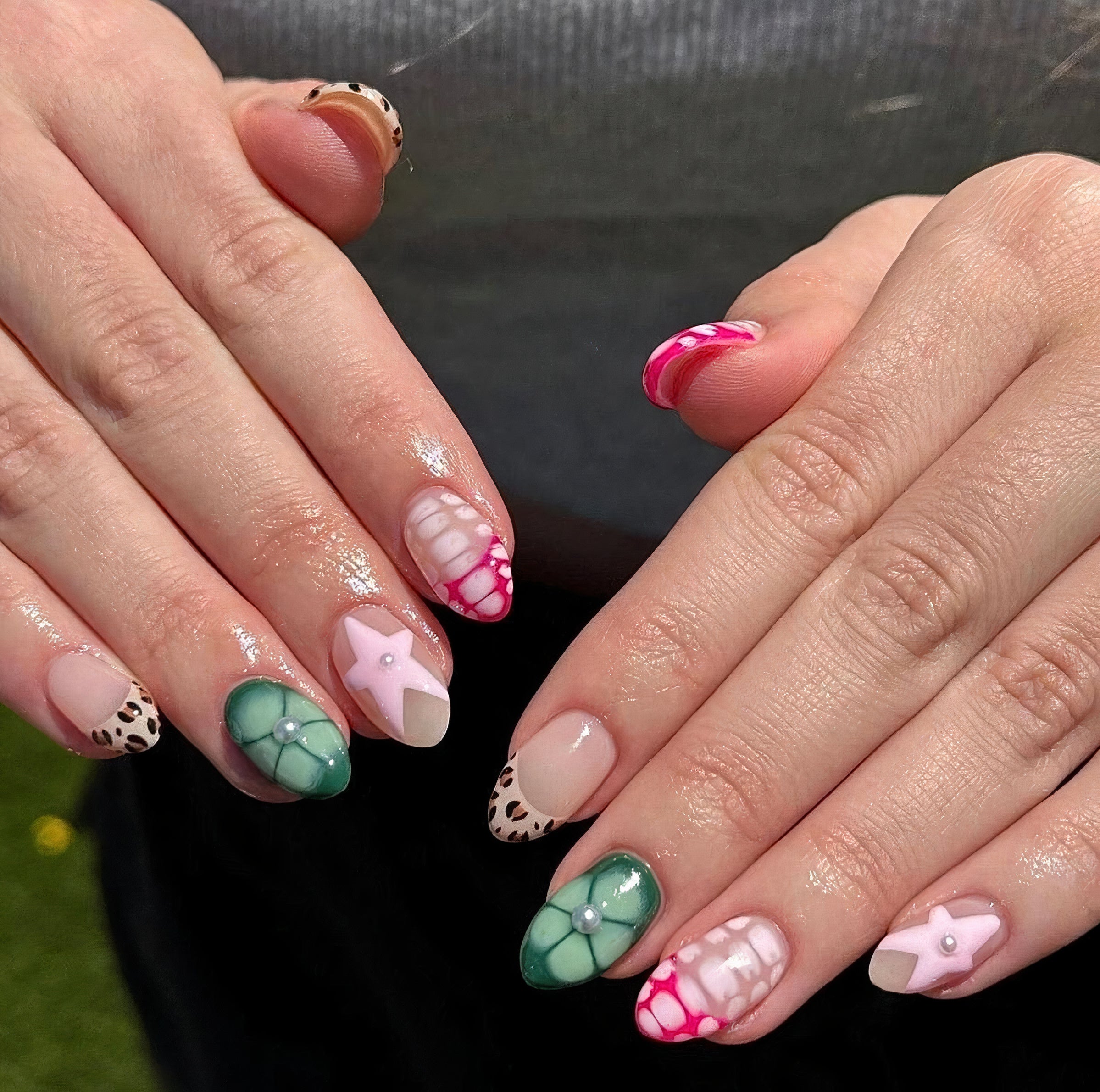 For the girl who loves a fun mix and match look who likes a little bit of feisty. This is a fun set with vibrant colors and oh so many details. Adorned with pearls, leopard prints, croc prints, electric pink and green colors, AND blooming gel flowers, this set reminds us of the fun days, like bid day!
